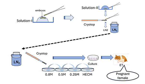 The golden (Syrian) hamster (Mesocricetus auratus) is a small rodent belonging to the family Cricetidae, which is taxonomically distinct from laboratory Muridae rodents, such as mice and rats. Hirose et al. recently applied intraoviductal genome-editing technology (i-GONAD) to hamsters and successfully generated gene knockout (KO) strains (Hirose et al. Proc Natl Acad Sc. USA, 2020). These KO hamsters serve as unique research models, providing insights that are not attainable using mice or rats. Hirose et al. reported a simplified vitrification protocol for preserving hamster embryos, enabling safe cryopreservation of KO strains (Hirose et al., A simplified protocol for vitrification of hamster embryos, p. 290–294). To overcome the strong in vitro developmental block in hamster embryos, we used in vivo-derived 8-cell embryos. Using this approach, 21–26% of vitrified embryos developed to term after embryo transfer. Owing to its reproducibility, our vitrification protocol is broadly applicable to laboratories working with hamsters. The upper image shows a wild-type golden hamster, and the lower images show vitrified-warmed 8-cell embryos restoring their normal morphology.