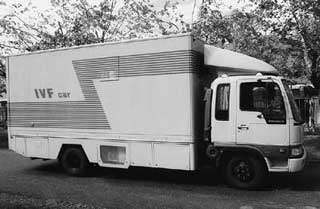 平成4年初春にIVF Carと命名した4tトラックの改造車(写真1)が完成し、試験的に地方のと畜場へ出向き性能試験を行いました。ところが、東京食肉市場と神戸市西部市場から卵巣を採取することが可能となったことと、近隣に東京(現家畜)バイテクセンターと神戸分室をそれぞれ整備して体外受精卵の大量生産に着手したことから、IVF Carの出番の機会はなくなり、それから当団前橋種雄牛センターの車庫で保管されていました。